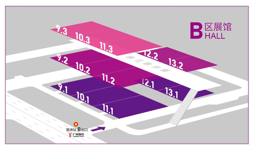 乘坐地鐵8號線或11號線在“琶洲”B出口,前往廣交會展館B區(qū)4號門進(jìn)入展館。