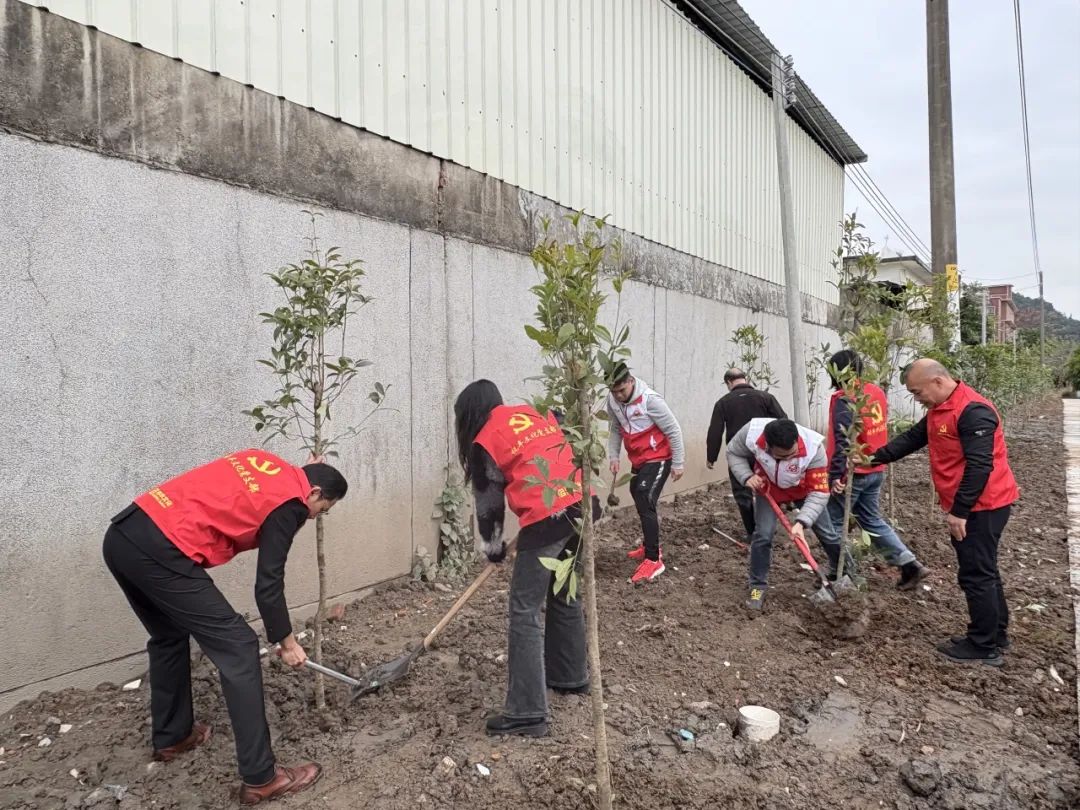 數(shù)十名黨員身著紅色馬甲、佩戴黨徽,在赤崗村植樹點(diǎn)揮鍬培土、扶苗澆水,合力栽下樹苗。黨旗飄揚(yáng)間,新綠漸次成行。